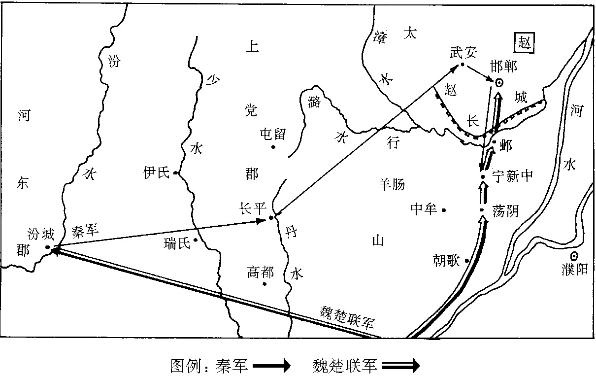 公元前二六八年秦昭王听从客卿范雎计谋,派五大夫绾伐魏取怀(今河南武陟西南,秦简《编年记》、《史记·范雎列传》)。赵、齐、楚三国因此合纵出兵,赵将赵奢、齐将鲍佞(“佞”一作“接”)“临怀而不救,秦人去而不从”(《赵策二》第二章)。秦因而暂停对魏的进攻。后二年秦再攻取魏的邢丘(今河南温县东),迫使魏服从于秦,即《秦策三》所说:“邢丘拔而魏请附。”范雎为秦相后,制定了伐取韩上党的战略。公元前二六五年秦伐取韩的少曲和高平,少曲因在少水(即沁水)的弯曲处而得名,在今河南济源东南,高平在少曲的西南,在今河南孟县西,两地正当太行山脉的西南,是韩上党郡到达韩都新郑的通道所在。范雎所制定的伐韩战略,就是要“北断太行之道”,腰断上党郡和韩国本土的联系,从而夺取韩的上党郡。次年秦又派白起攻取韩的陉城(当在太行陉的旁边),“斩首五万”(《秦本纪》、《白起列传》)。当白起围攻陉城时,范雎向秦昭王提出了“毋独攻其地而攻其人”的战略方针,指责过去魏冉“十攻魏而不得伤”,是因为只攻地而不攻人,使得魏还能保持战斗的力量。他主张今后攻韩,必须“毋独攻其地而攻其人”,从而削弱韩相张平所有的力量,使张平被逐走而由不如张平的人继任,这样再与谈判,就可多得。[7]
