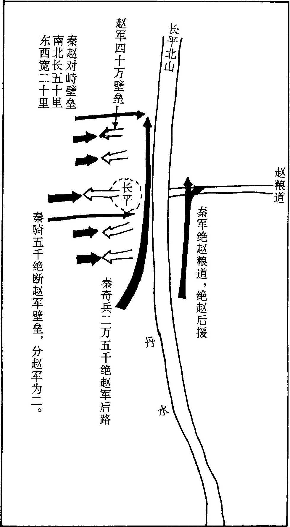 由于廉颇筑垒固守,秦、赵两军在长平相持了三年,不分胜负。后来赵孝成王中了秦的反间计,听信了赵奢儿子赵括的夸夸其谈,起用赵括代替廉颇为将。秦在反间计成功后,就“阴使武安君白起为上将军,王龁为尉裨将”,主持这场大决战。公元前二六〇年七月,赵括一到前线,就大举出兵进攻秦军。白起采用了迂回的运动的战略,先在正面诈败后退,另外布置了两支奇兵,以便乘机袭赵军后路。赵军一直攻到了秦军的壁垒下,不能攻入,而秦的一支奇兵二万五千人已经断绝了赵军后路,另一支奇兵五千骑兵又切断赵的壁垒,把赵军切成两段。赵军战斗不利,筑壁垒坚守以待后援。秦昭王听到消息,亲自赶到河内,赐民爵一级,把十五岁以上的壮丁悉数征发到长平,用来堵截赵的援兵和接济的粮食,并且绝断赵的粮道。到九月间,赵军被困了四十六天,饥饿乏食,分为四队轮番向秦反攻,仍不能突出重围。最后赵括亲自带兵搏战,被秦军射死。于是赵军大败,全军四十多万人全都被俘。白起仅仅释放二百四十个年幼战俘,竟把四十多万人全部活埋了(《史记·白起列传》)。在这一战役中,赵兵前后死亡了四十五万人,秦军也死者过半。《吕氏春秋·应言篇》说:“秦虽大胜于长平,三年然后决,士民倦,粮食□(原缺一字)。”