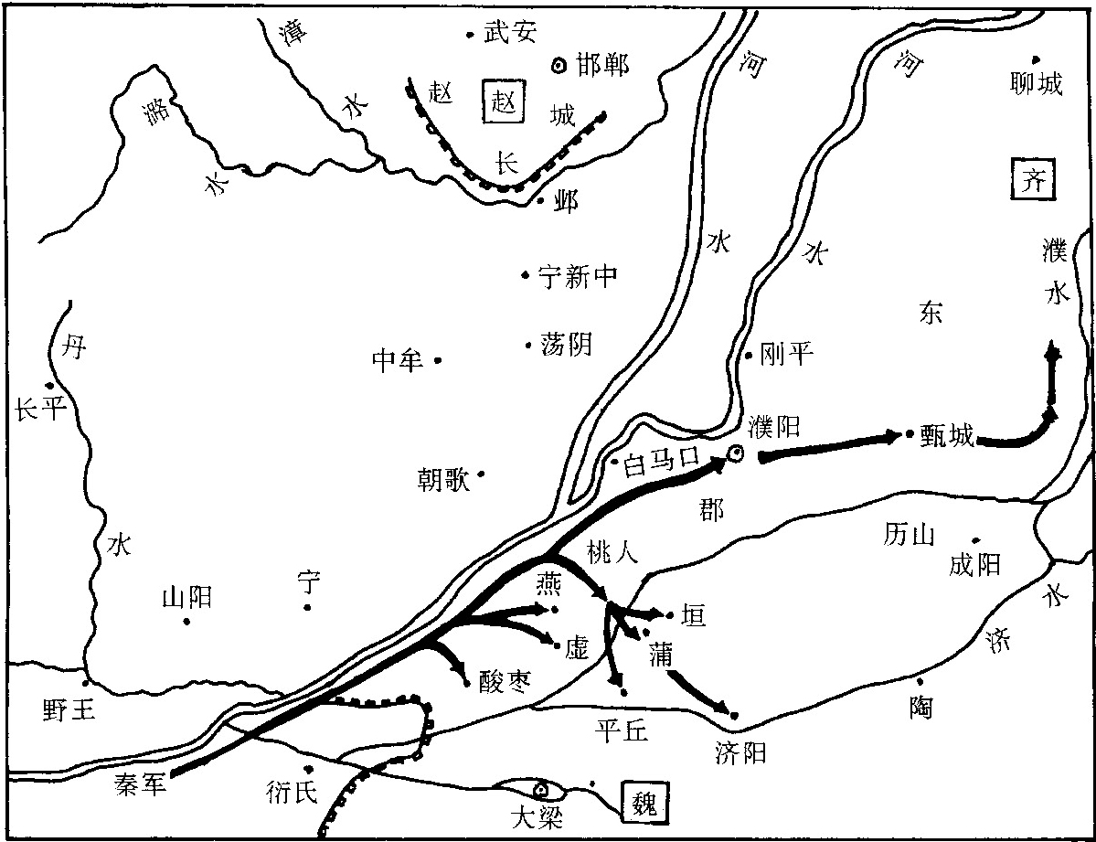 秦攻取魏地建置东郡 公元前二四四年,秦又攻取了韩的十三城,以及魏的、有诡(《史记·秦始皇本纪》)。两年后,秦兵又分南北两路进攻魏国,蒙骜先后攻取了魏的酸枣(今河南延津西南)、燕(今延津东北)、虚(今延津东)、桃人(今河南长垣西北)、山阳(今河南焦作东南)和雍丘(今河南杞县)、长平(今河南西华东北)等二十城,继而又攻取了魏国前此所兼并的卫地,把所得成皋以东酸枣、燕、虚、桃人等地,连同卫的旧都濮阳建置为东郡(《史记·秦始皇本纪》、《战国策·秦策四》有人说秦王语)。到次年,秦又攻取了魏的朝歌(今河南淇县)。因为卫国过去和秦连横而被魏灭亡,成为魏的附庸;这时秦就把卫君角连同其支族迁到了野王(今河南沁阳),作为秦的附庸。