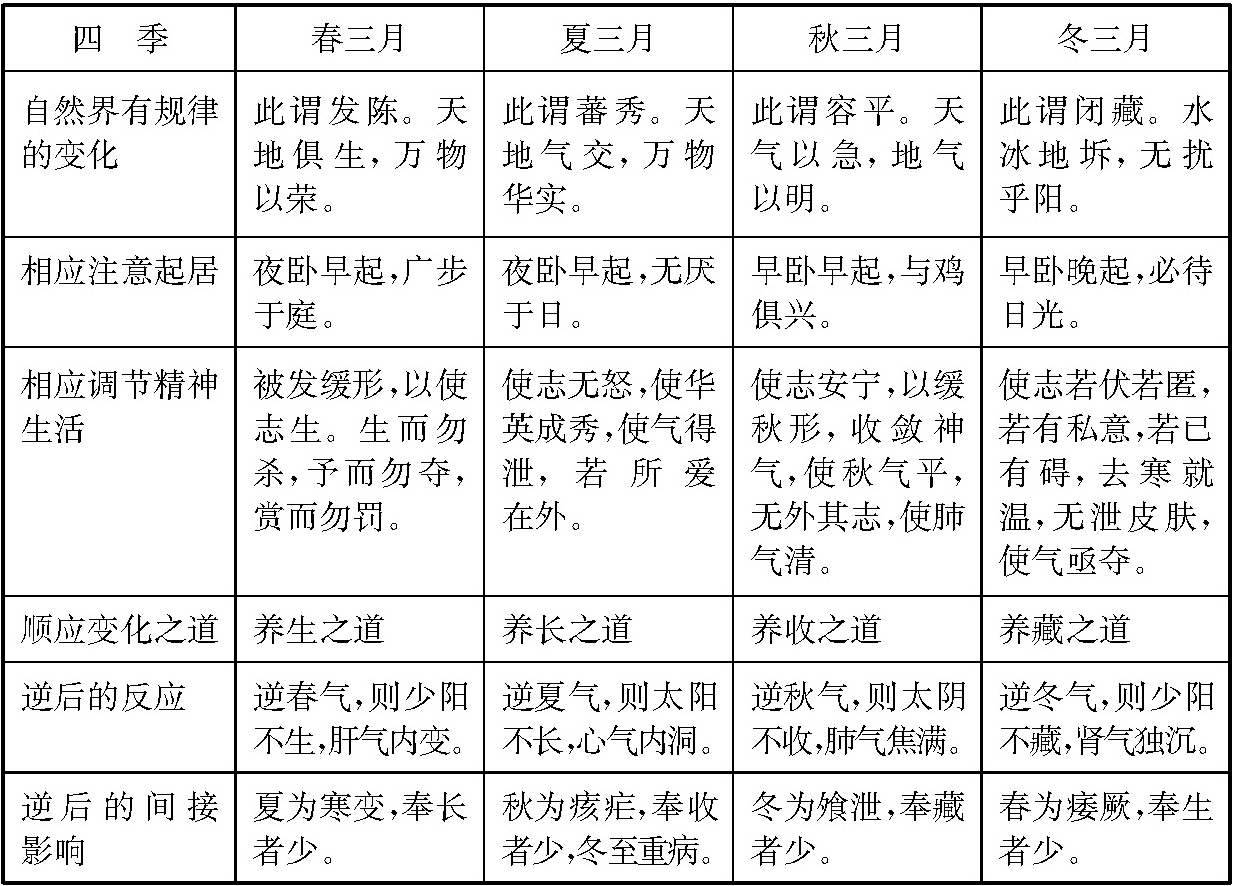 《素问》特别强调疾病的预防,较治疗更为重要。《四气调神大论篇》主张“不治已病、治未病,不治已乱、治未乱”,认为“病已成而后药之,乱已成而后治之,譬犹渴而穿井,斗而铸锥,不亦晚乎!”它把四季的运行看作自然界“生”、“长”、“收”、“藏”有规律的变化,认为人们生活在这个有规律变化的自然环境里,必须相应地按照自然界变化的规律调节起居生活和精神活动,使得身体内部的阴阳顺应自然界的阴阳而变化,“春夏养阳,秋冬养阴,以从其根”,这样就能保持健康,不生疾病,叫做“得道”。所谓“得道”,不是别的,就是掌握和顺应自然界变化的规律。这种理论,是和当时的阴阳五行家和道家有相通之处的。为了便于理解,我们把《四气调神大论篇》内容,列为一表如下: