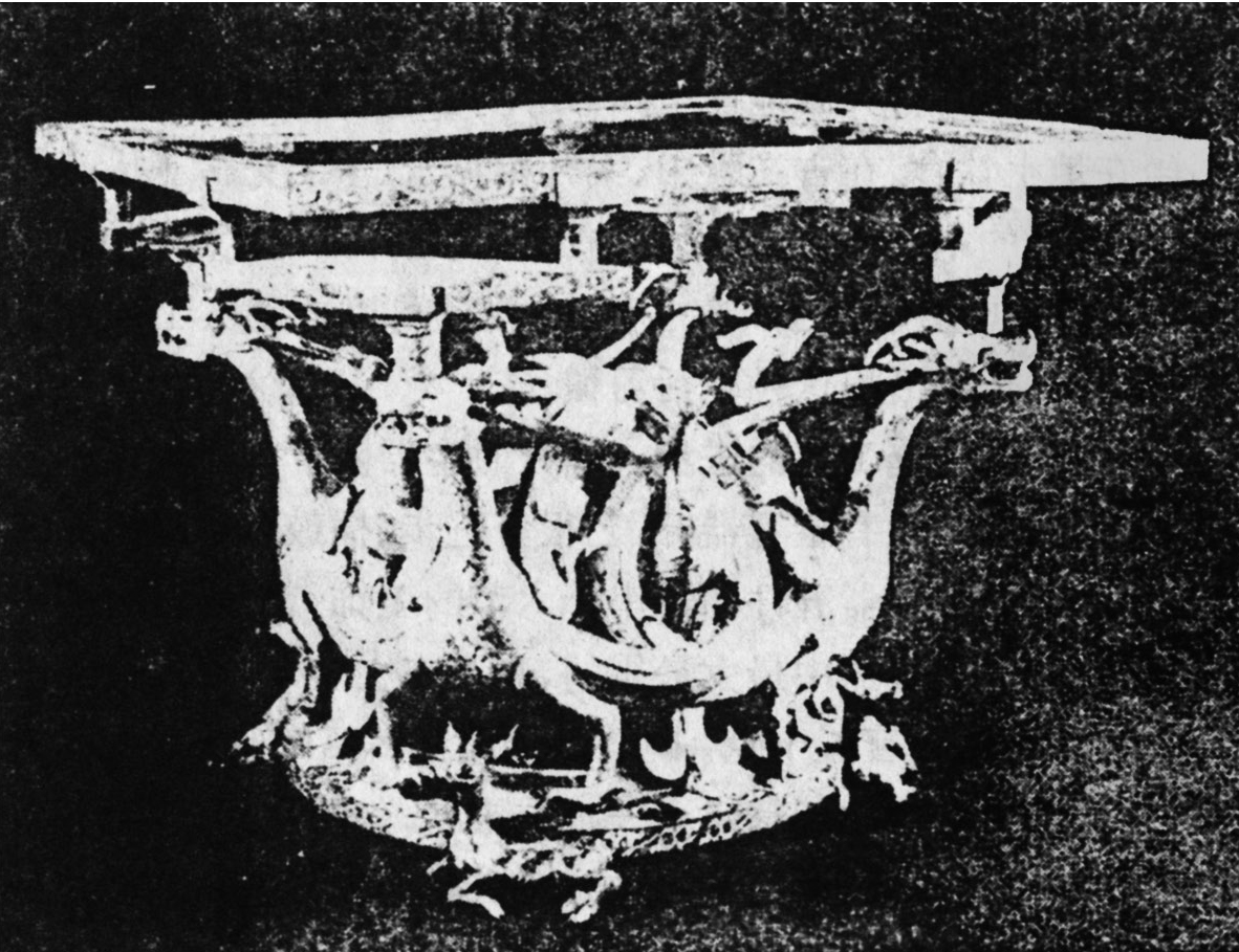 一九七八年河北平山三汲中山王墓出土。高三十七点四厘米,长宽各四十八厘米。案是战国时开始流行的家具。此案的木质台面已朽毁,台面四边的铜边框及其相连的铜座保存完整。铜座底层有四只梅花鹿承托一个圆圈,在圆圈上有四龙和四凤盘绕成半球形,四条龙头从四角升起,顶住斗拱,承托着方案的台面。所有四鹿、四龙、四凤,姿态生动,并错有花纹图案。整个铜座表现了巧妙的工艺构思。