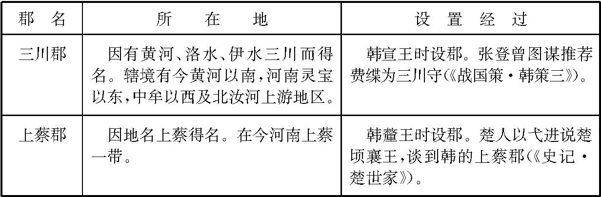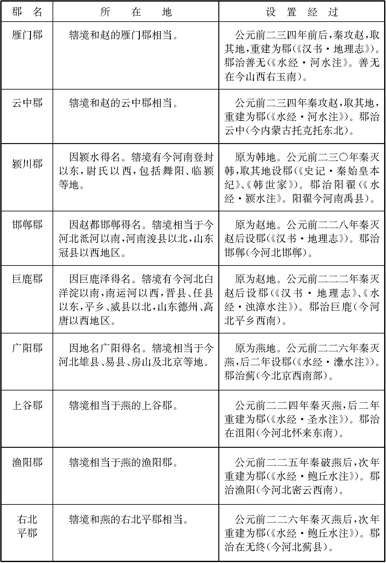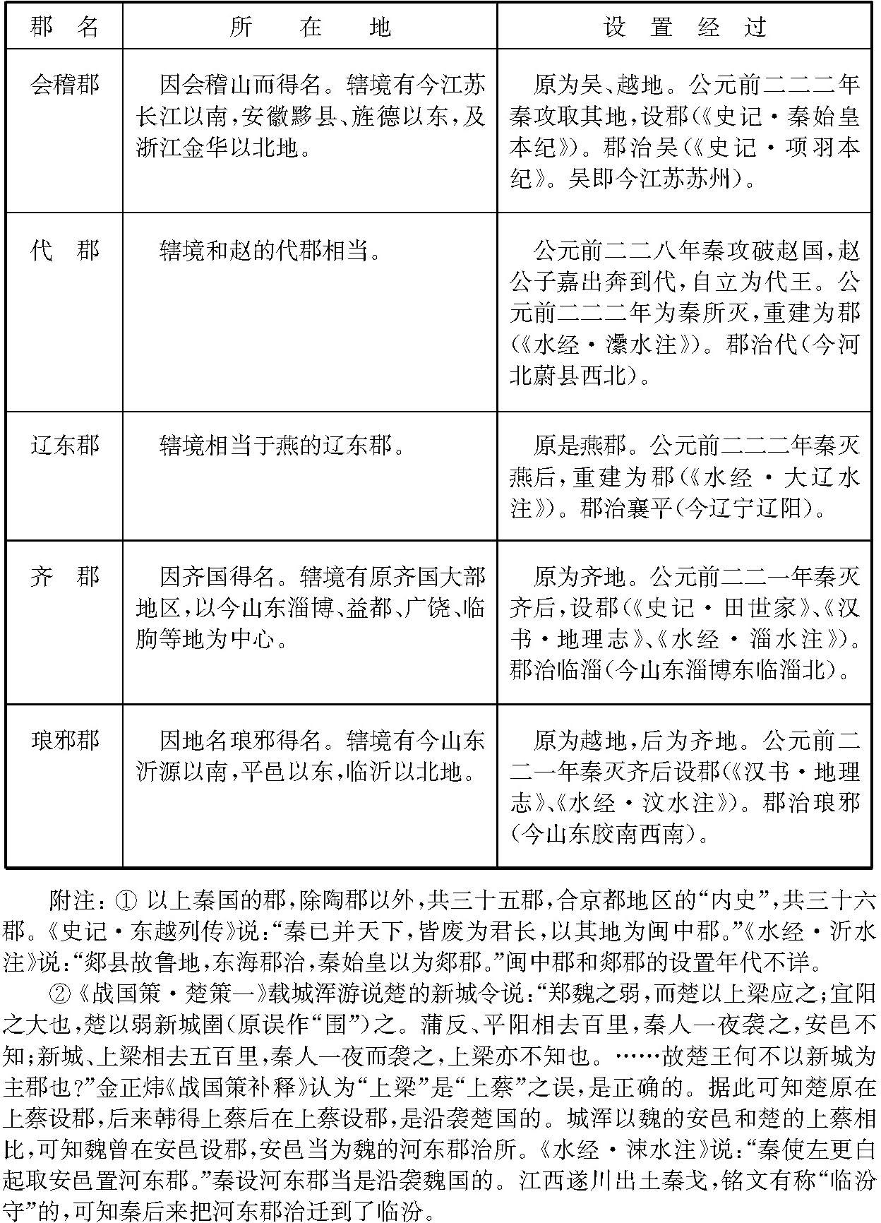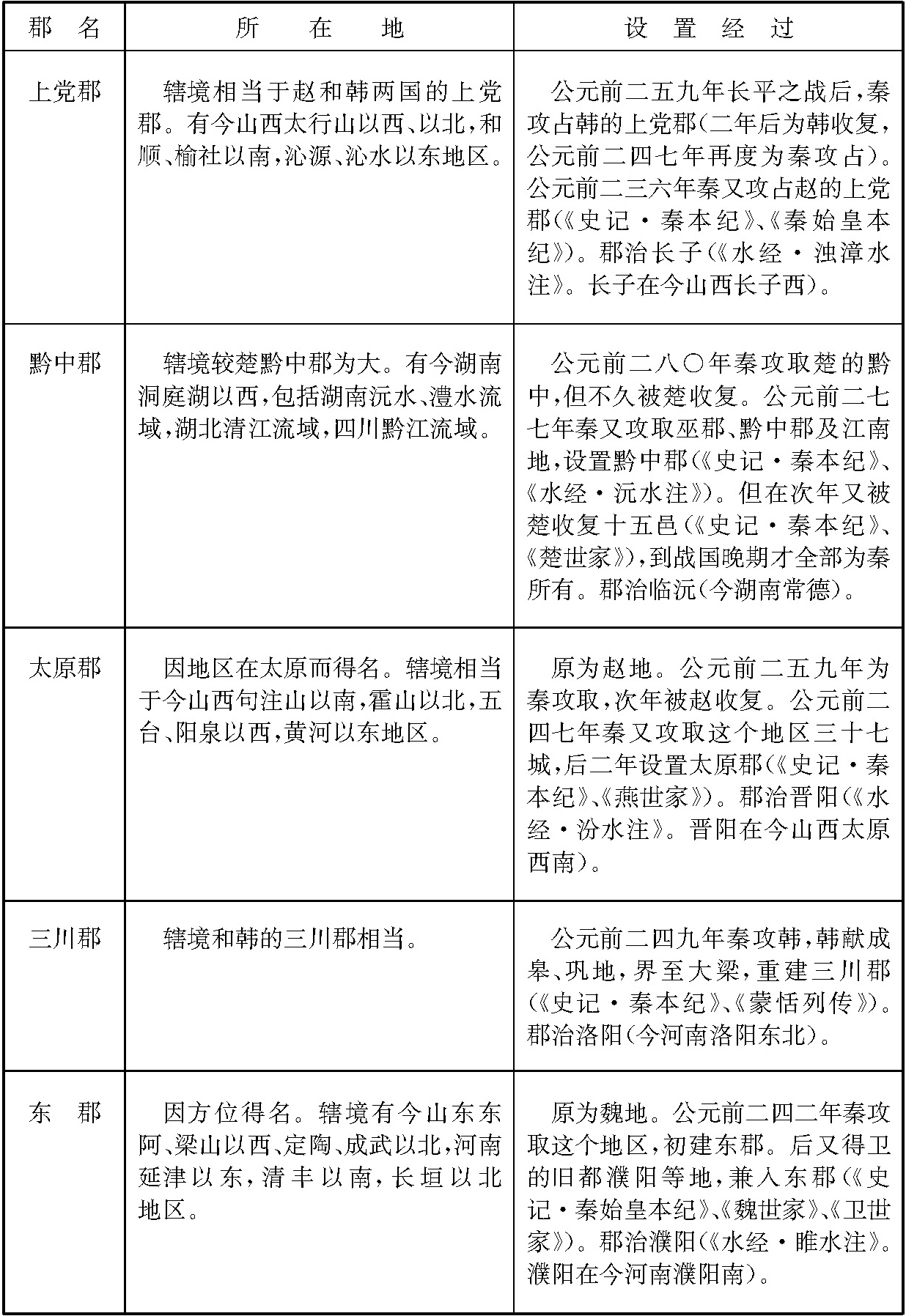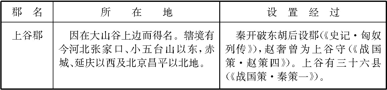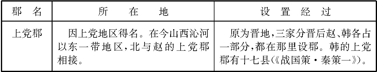 战国时代,除齐国以外,各国为了加强中央集权统治,并出于攻守的需要,先后在边地设郡。秦在统一六国过程中,又不断在新开拓的地区设郡。当时各国设郡的情况比较复杂,为便于了解起见,列为简表如下: