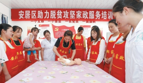 2021年6月19日,遂宁市安居区分水镇大码口村农家妇女正在家政服务培训活动现场学习如何当好“育儿保姆”(在涉改村开展社会组织专业社工参与脱贫攻坚项目试点)