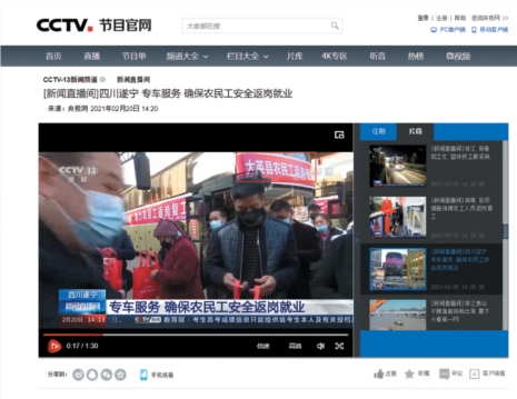 2021年2月20日,农民工返岗春风行动在中央电视台财经频道(CCTV-2)、新闻频道(CCTV-13)同时报道