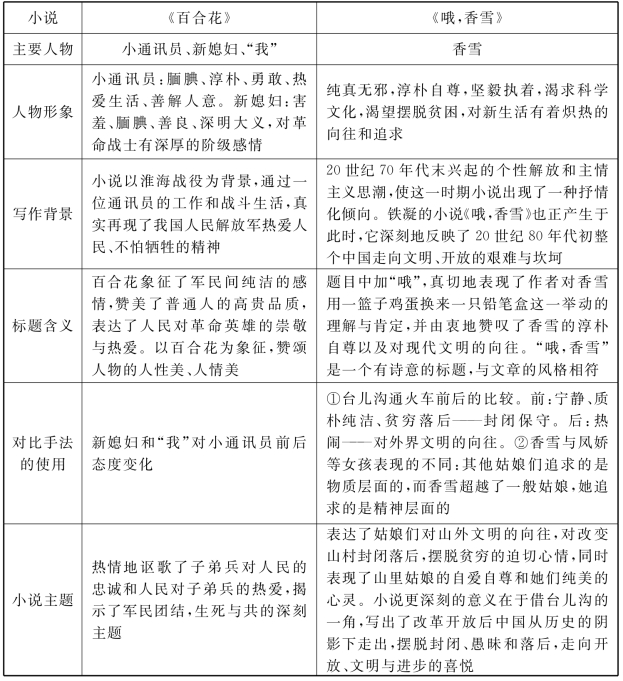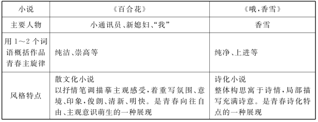 (3)精读2篇小说(表2),利用表格形式归纳,可运用对比阅读的方法,比较同一篇小说里同一人物对相同事、物前后的不同表现和心理变化,不同人物对待同一事、物的不同表现,不同小说中主人公形象的异同。结合小说写作背景,理解小说主题。概括2篇作品里的青春主旋律;深层次探究2篇小说对现代小说散文化和诗化特征的尝试与推动(选做)。