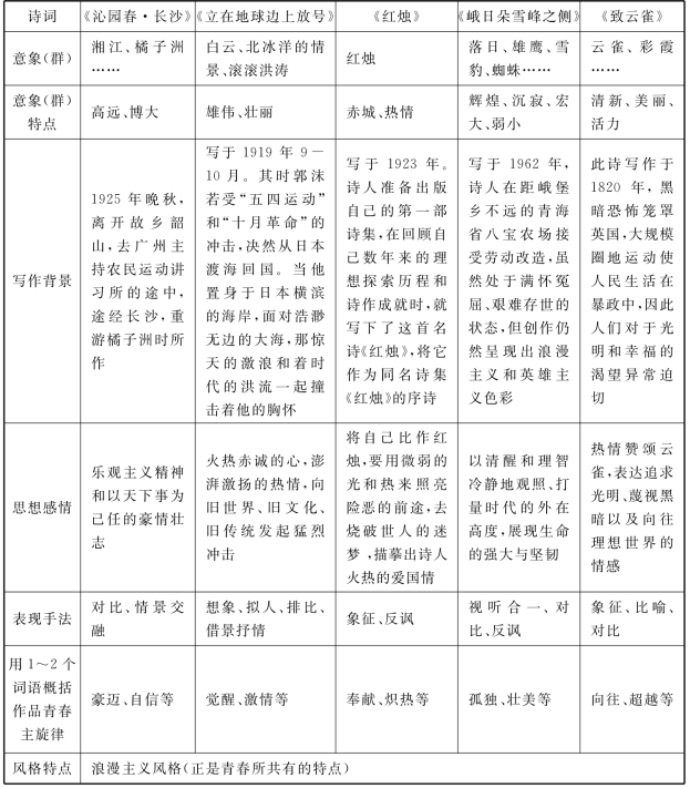 两者同为新诗草创时期的重要作品,都属于浪漫主义风格。讨论:这两首新诗从内容、手法、思想上共同呈现出了青春的哪些特点?提示:个性意识的觉醒,爱国主义的体现,澎湃的激情,炽热的向往,渴望打破和创造,富于想象。