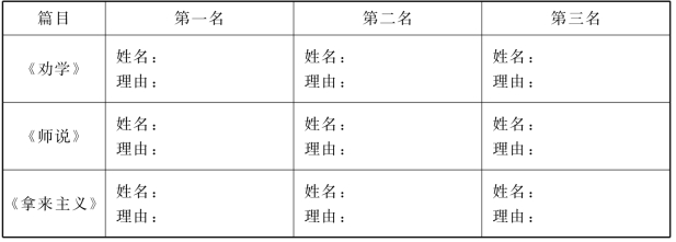 学生借助课下注解及《古代汉语字典》等工具书熟读《劝学》《师说》两篇课文,在小组内评选“诵读明星”,同时由小组推选,在班级内评选“诵读明星”。