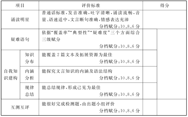“自我知识构建”重在建构意识,能探究文言知识的内涵及语法结构,以能总结规律、形成己见为最佳。