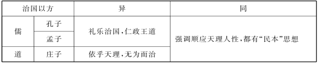 初步感知儒家和道家的思想内涵。分析儒、道两家在治国之策上的异同,并在文中找出依据,完成表1。