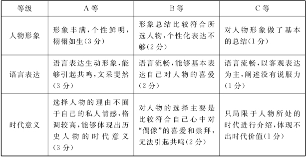 (1)内容30%:要求内容紧扣人物的主要思想,逻辑严密,个性突出,富有创意,富有启发性和号召力,3分。
