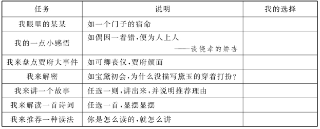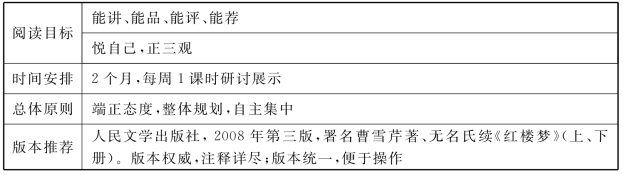 本节对《红楼梦》的整本书阅读与研讨做了如下教学总体设计:扎实陪读,自主研习,专题展示。前二者7课时,后者2课时。