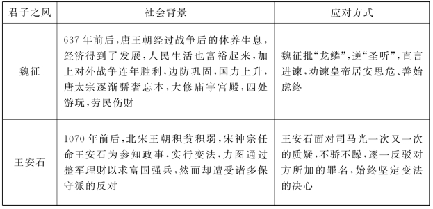 (2)在此基础上归纳分析:魏征与王安石都是中国古代著名的政治家,都为国家的长治久安而殚精竭虑,二人所处时代虽不同,但其君子之风却无异。请同学们归纳对比两位政治家面临的现实背景及其应对方式,完成表1。
