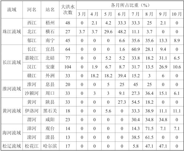 表3-1 全国主要河流代表站大洪水各月出现频率