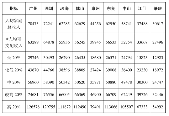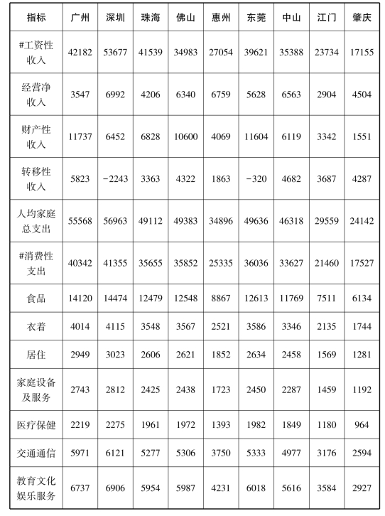 表3-1 珠三角各市居民家庭基本情况(2020年) 单位:元