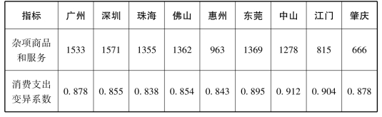 从某种程度来讲,家庭人均收入的差异,客观上促使居民消费开支的构成发生变化。就家庭消费开支而言,珠三角各个城市间的消费差异就更加突出了。其中,排在第一位的深圳市为56963元,排在最后一位的肇庆市为24142元。但在家庭消费总支出上的差异,并不像在家庭总收入上的差异那么显著,这主要源于花费在生活必需品上的支出相对稳定。但在医疗、交通、教育、文化娱乐和服务性消费上则体现得更加突出。关于各城市居民消费支出结构的变异系数,从表3-1可知,变异系数与城市的发达程度成反比,越是发达的城市,其变异系数就越小,这表明经济上越发达其居民消费支出结构的差异相对越小,具体表现在无论是生活性消费支出还是享受性消费支出,其变化的幅度都比较小。从区域消费水平差异的变异系数分析,整体上来看,其消费支出的区域变异性系数为0.95,食物支出的区域变异性系数为0.87,服饰支出的区域变异性系数为0.96,明显小于全部消费支出的区域变异系数,这表明在食物、服饰等生活性消费支出方面的区域差异并不显著。不过,我们也发现花费在交通通信、文化娱乐、教育和医疗上的消费支出的区域变异系数达到了0.93,这表明在服务性居民消费需求方面,区域间的差异比较突出。由此,我们可以得出,消费需求的区域差异是决定区域产业协同发展的基础条件。