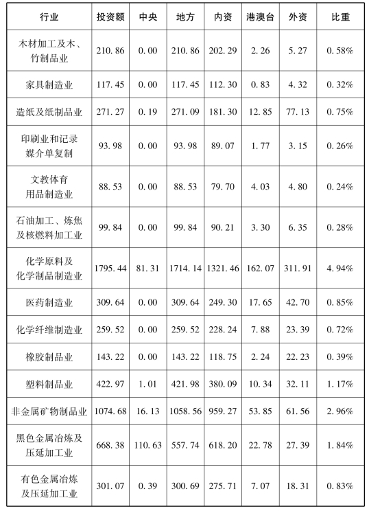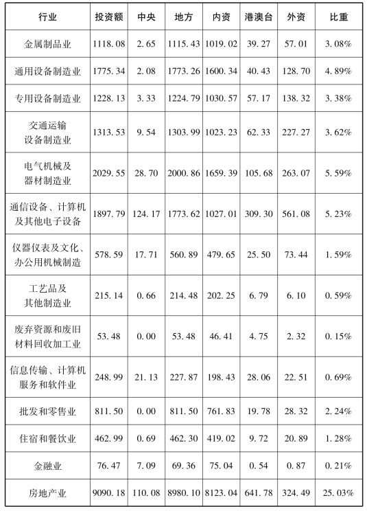 关于产业的投资偏好,如表3-4所示,不同的产业投资回报率和不同的政府支持力度,导致产业的投资倾向出现比较大的差异。2020年,珠三角投资额的行业分布非常不均衡,其中,房地产投资额占比最高,占总投资额的23%以上。其他投资占比较大的行业主要有非金属矿物制品业、通用设备制造业、交通运输设备制造业、通信设备、计算机等行业领域,其投资占比均超过2.1%。仔细观察,这些行业基本都集中在资本密集型行业,对于服务性行业的投资热情较低,这说明资本偏好投资于以制造业为代表的资本密集型行业。分行业来看,投资主要分布在电子产品制造、机械设备制造和金属材料制造等领域,导致城市间出现严重的产业同构现象,影响区域产业的协同发展。