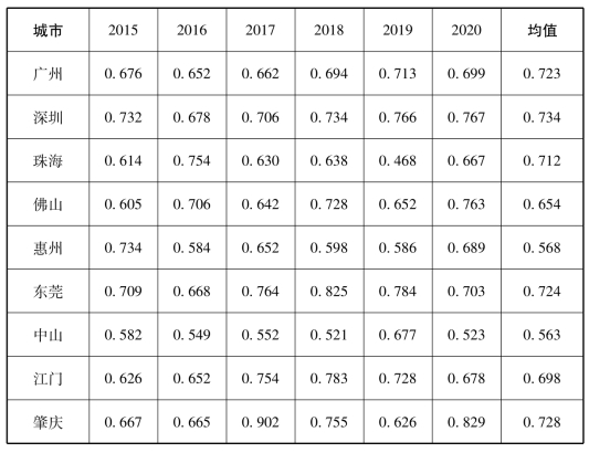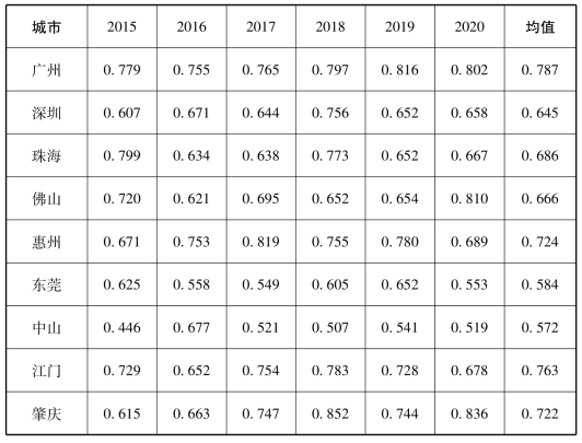 表7-5 珠三角9市第一产业与第二产业协同度(2015~2020年)