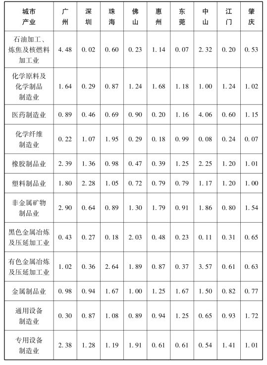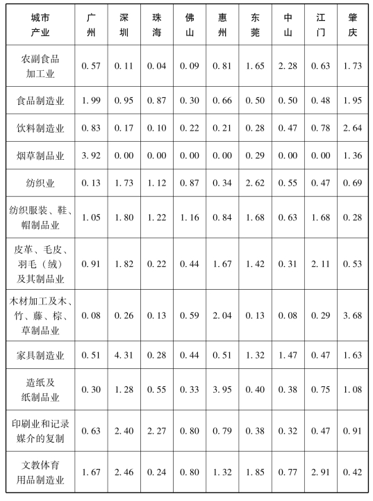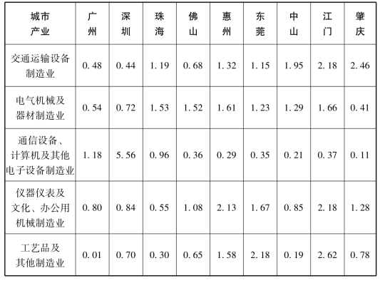 由表7-9可知,整体来看珠三角各城市的产业呈现出比较明显的差异性,各城市的优势产业重叠度相对较低。拿深圳和广州来说,广州的优势产业有食品制造业、烟草制品业、纺织服装业、文教体育用品业、石油加工业、化学制造业、橡胶制品业和专用设备制造业等,深圳的优势产业有纺织业、皮革毛皮及其制品业、家具制造业、印刷业、塑料制品业、通信设备、计算机及其他电子设备制造业等,两者共有2个优势产业重叠,说明各城市间的产业分工还是相当明显的。从优势产业的数量来看,东莞以15个优势产业排在首位,最少的佛山也有9个,说明整个珠三角的优势产业众多,具有较强的产业竞争力。从产业的优势程度来看,广州区位熵均值最高,平均达到1.21,最低的也是佛山,只有0.8。单个来看,深圳的通信设备、计算机及其他电子设备制造业的区位熵最高,达到惊人的5.56,说明深圳在通信设备与计算机领域中处于绝对的领先地位。佛山的专用设备制造业、惠州的仪器仪表制造业、东莞的纺织业、中山的医药制造业、江门的文教体育用品制造业等优势相对比较突出。