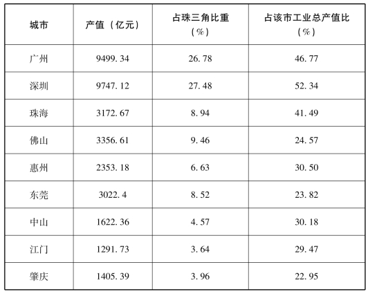 总的来说,作为珠三角的核心城市,广州和深圳不管是优势产业数量还是产业优势程度,都处于领先地位。特别是在一些附加值高、技术先进、创新度高的高端产业,如通信设备、计算机及其他电子产业上的优势非常明显,说明广州和深圳的产业结构层次较高,具备较强的产业竞争优势。而其他城市的优势更多地体现在一些传统产业上,比如佛山的纺织服装业和有色金属冶炼及压延加工业、惠州的木材加工业和工艺品及其他制造业、东莞的农副食品加工业和纺织业、肇庆的饮料制造业和烟草业等都属于传统的劳动密集型产业,其产品附加值和科技含量较低,产业结构层次偏低。总之,珠三角各城市间的产业优势和产业层次差异明显,产业梯度和产业分工格局基本形成。