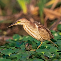外形特征:小型涉禽,体长30~38cm。雄鸟额、头顶、枕部和冠羽铅黑色,微杂以灰白色纵纹,头侧、后颈和颈侧棕黄白色;背、肩和三级飞羽淡黄褐色,腰和尾上覆羽暗褐灰色;初级飞羽、次级飞羽和尾羽黑色;翅上覆羽淡黄褐色;下体自颏和喉淡黄白色。喉至胸淡黄褐色,胸侧羽缘棕红色。下颈基部和上胸具黑褐色块斑。羽缘黄褐色,腹和尾下覆羽淡黄白色。两肋、腋羽和翼下覆羽皮黄白色。虹膜黄色;嘴黄色,嘴端黑色;跗跖黄绿色。