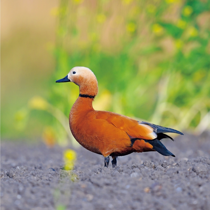 外形特征:大型鸭科,比家鸭稍大,体长51~68cm。全身赤黄褐色,翅上有明显的白色翅斑和铜绿色翼镜;嘴、脚、尾黑色;雄鸟有一黑色颈环。飞翔时黑色的飞羽、尾、嘴和脚、黄褐色的体羽及白色的翼上、翼下覆羽形成鲜明的对照。虹膜暗褐色,嘴和跗跖黑色。