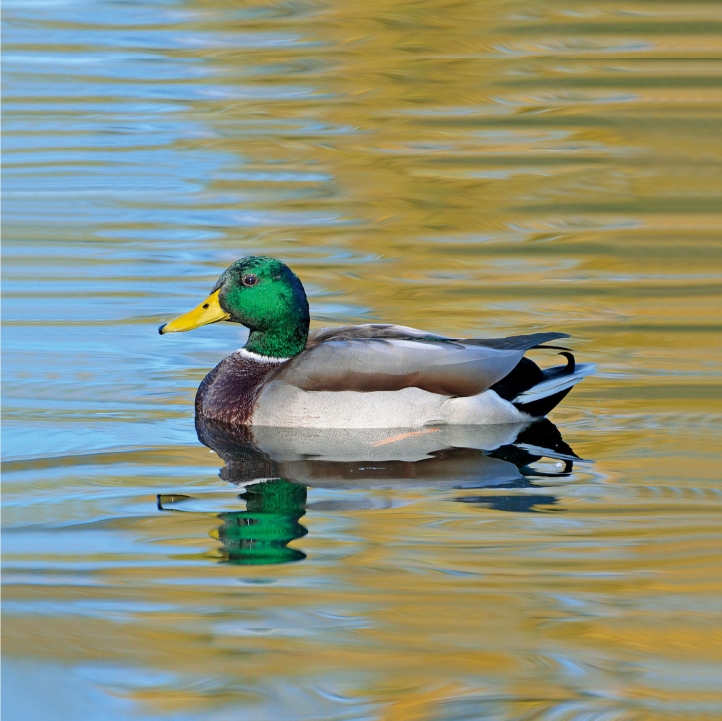 外形特征:大型鸭类,体长50~60cm。外形大小和家鸭相似。雄鸟头和颈辉绿色,颈部有一明显的白色领环。上体黑褐色,腰和尾上覆羽黑色,两对中央尾羽亦为黑色,且向上卷曲成钩状;外侧尾羽白色。胸栗色,翅、两肋和腹灰白色,具紫蓝色翼镜,翼镜上下缘具宽的白边。雌鸟全身黄褐色而有斑驳褐色条纹,两肋和上背具鳞状斑,有深褐色贯眼纹,翼镜蓝紫色。虹膜黑褐色;雄鸟嘴黄绿色,雌鸟暗棕黄色略带褐色;跗跖橙黄色。