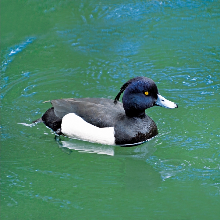 外形特征:中等体型的水鸭,体长40~47cm。头带特长羽冠,雄鸟亮黑色,腹部及体侧白。雌鸟深褐,两胁褐而羽冠短。飞行时二级飞羽呈白色带状。尾下羽偶为白色。雌鸟有浅色脸颊斑。雏鸟似雌鸟但眼为褐色。头形较白眼潜鸭顶部平而眉突出。为深水鸟类,善于收拢翅膀潜水。虹膜金黄色;嘴蓝灰色或铅灰色,尖端黑色;跗跖铅灰色;蹼黑色。