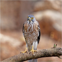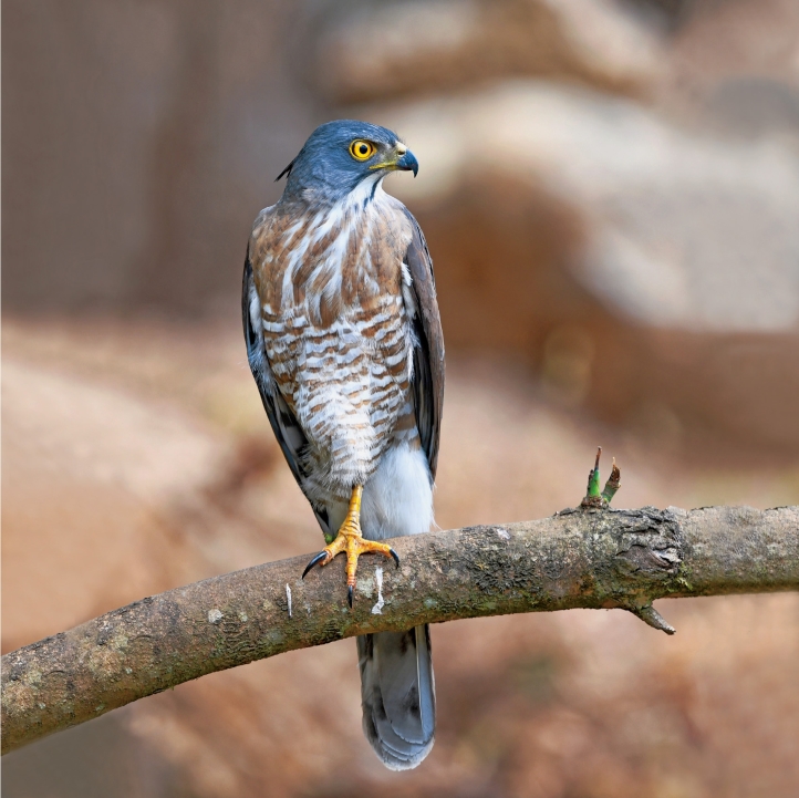 外形特征:中型猛禽,体长41~49cm。头前额至后颈鼠灰色,具显著的灰色冠羽,其余上体为褐色,尾具4道宽阔的暗色横斑。喉部白色有黑褐色中央纵纹,胸棕褐色,具白色纵纹,其余下体白色,具窄的棕褐色横斑。虹膜金黄色;嘴峰和嘴尖黑色,口角黄色;脚和趾淡黄色,爪黑色。