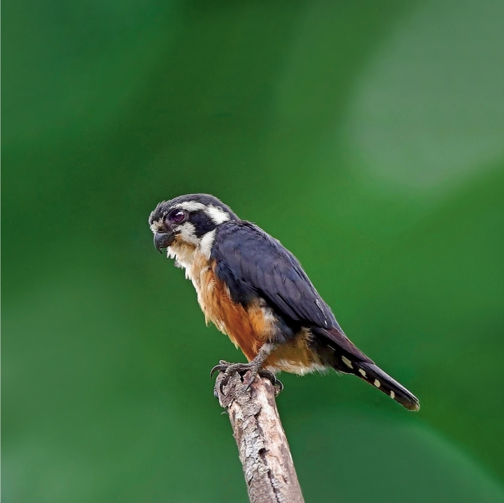 外形特征:小型猛禽,体长16~19cm。前额为白色,眼睛上有一条宽阔的白色眉纹,往后经耳覆羽与上背的白色领圈相连,颊部和耳覆羽为白色,从眼睛前面开始有一条粗著的黑色贯眼纹经过眼睛斜向下到耳部。虹膜深褐色;嘴铅灰色;跗跖被羽。