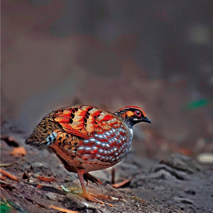 外形特征:小型雉科鸟类,体长26~29cm。体型与鹧鸪相似的鹑鸡类。雄鸟额至后颈深栗色,具有宽而长的黑色眉纹,眼睛周围红色。上体橄榄褐色,具黑色的半月形横斑,腰部还有箭形和三角形的黑斑。颏、喉黑色,缀有白纹。胸部淡灰色或灰橄榄色,前颈与胸之间有一个白色的横带将颈与胸分开,所以叫做环颈山鹧鸪。雄鸟虹膜褐色至红褐色,雌鸟褐色;嘴黑色,眼周皮肤红色;腿、脚橄榄褐色或铅灰色。