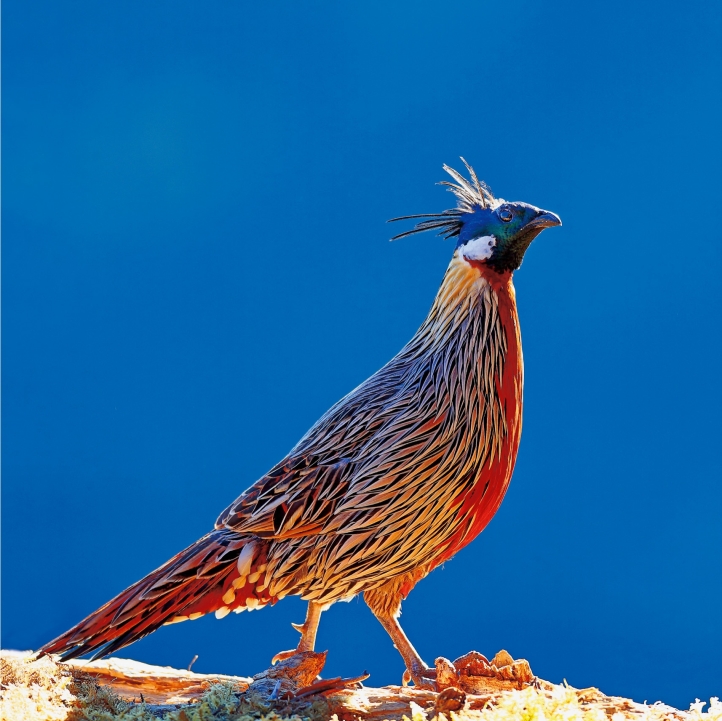 外形特征:体长39~63cm。体形适中,头顶棕褐色,冠羽细长,再后有更长的黑色而具辉绿色羽缘的枕冠向后延伸;颈侧在耳羽后面下方有一大形的白色块斑;下眼睑具一小白斑;头的余部包括颏、喉等均为黑色,带暗绿色的金属反光;上体羽毛呈披针形,散布“V”字形黑纹。下体中央至腹部为深栗色。虹膜褐色;嘴黑;脚暗红色。