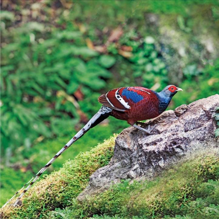 外形特征:大型雉科鸟类,雄鸟体长96~104cm,雌鸟体长47~50cm。雄鸟头顶褐绿色,两侧有白色眉纹,上体背羽紫栗色具黑斑,肩羽具宽阔的白色块斑,下背,腰,尾上覆羽白色具蓝黑色斑,翅羽暗褐色,尾长,尾羽灰色具有黑栗二色并列的横斑,下体腹部与两胁栗色。雌鸟体羽棕褐色,满布黑色斑纹,上背有白色矢状斑,外侧尾羽大都栗色。虹膜深褐色;嘴角质色;跗跖青灰色。