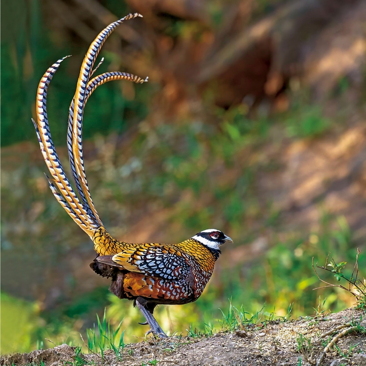 外形特征:大型雉科鸟类,雄鸟体长141~197cm,雌鸟体长56~69cm。雄鸟头顶和颏、喉、颈均为白色,嘴基至后枕具一黑色宽带。脸部裸皮红色,颈部黑白两色,形成明显颈环。上体余部金黄,具黑褐色鳞状斑。中央两对尾羽特长,有两条黑栗并列的横带。下体栗红色,具黑白色斑。雌鸟上体主要为棕褐色,下体浅栗棕色,各羽具明显白色天状斑,尾羽较雄鸟短。虹膜深褐色;嘴角质色;跗跖灰褐色。