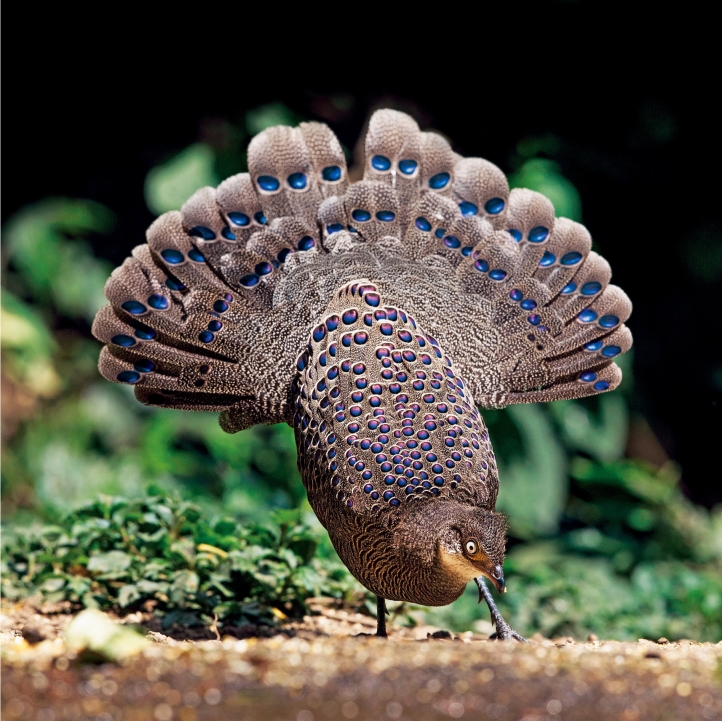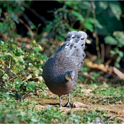 外形特征:中型雉科鸟类,雄鸟体长66~76cm,雌鸟体长47~52cm。雄鸟全身羽毛黑褐色,密布几乎纯白色的细点和横斑;上背、翅膀和尾羽端部具紫色或翠绿色金属光泽的绚丽的眼状斑,象孔雀羽毛上的孔雀斑一样,故名之。雌鸟体型较小,尾羽稍短,体色与雄鸟相似而较暗,眼状斑不明显。雄鸟虹膜灰色,雌鸟灰褐色;嘴铅灰色;跗跖灰褐色。
