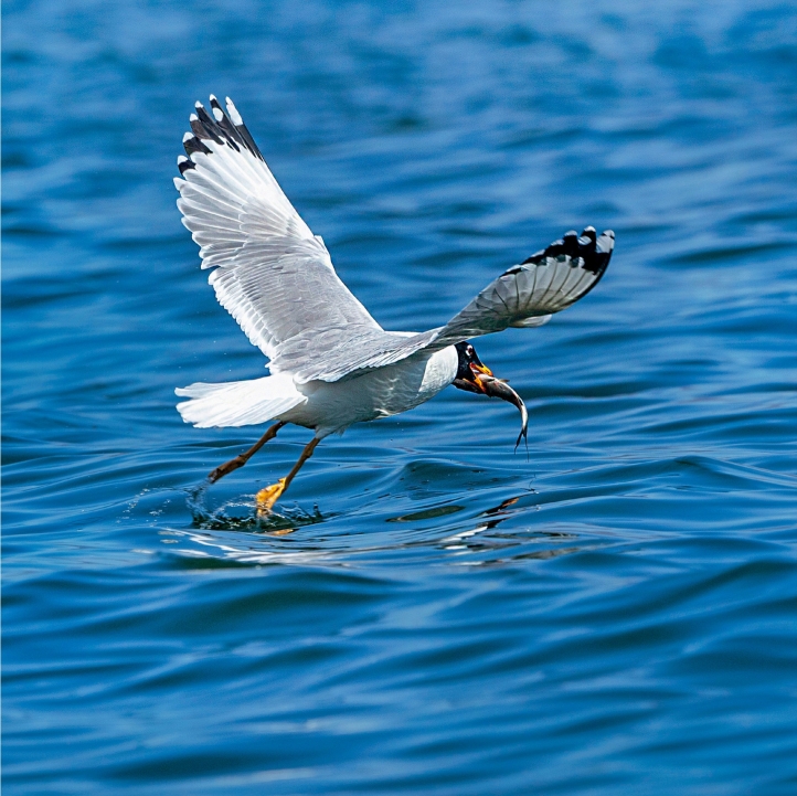 外形特征:体长约68cm,是形体较大鸥类。渔鸥夏羽头黑色,眼上下具白色斑。后颈、腰、尾上覆羽和尾白色。背、肩、翅上覆羽淡灰色,肩羽具白色尖端。下体白色。冬羽头白色,具暗色纵纹,眼上眼下有星月形暗色斑。虹膜暗褐色;嘴粗状,黄色,具黑色亚端斑和红色尖端;脚和趾黄绿色。