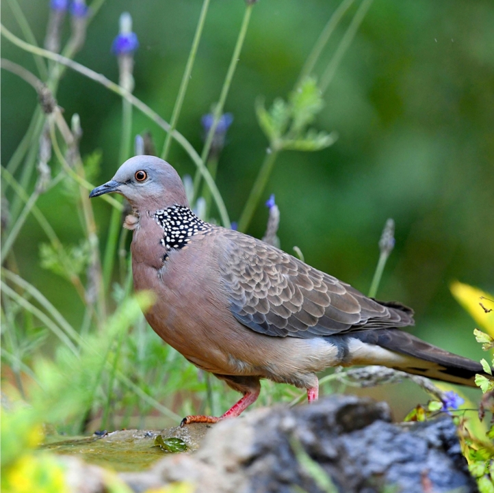 外形特征:中型斑鸠,比鸽子略小,体长30~33cm。颈部有黑白色的珠花图案,脚红色,尾略显长,外侧尾羽前端的白色甚宽,飞羽较体羽色深。颈侧满是白点的黑色块斑。虹膜橘黄色;嘴黑色;跗跖红色。