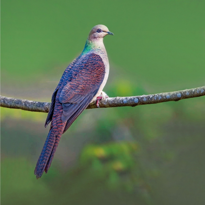 外形特征:中型鸠鸽,体长36~38cm。背及尾满布黑色或褐色横斑。头灰,颈背呈亮蓝绿色。胸偏粉,渐至白色的臀部。雌鸟无亮绿色。背上横斑较密,尾部横斑有别于同地区的其他鹃鸠。体色与其他鸠鸽类的绿色或灰色不同,雄鸟的前额、眼先、颊、颏和喉皮黄色,微沾紫色,头顶、后颈和颈侧绿紫色而具金属光泽。虹膜蓝色,外圈粉红色;嘴黑色;跗跖红色。
