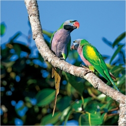 外形特征:大型鹦鹉,雄鸟体长43~50cm,雌鸟体长37~45cm。羽毛艳丽,善仿人语。雄鸟眼周及额沾淡绿色,狭窄的黑色额带延伸成眼线;上喙红色,下喙黑色;中央尾羽渐变为偏蓝色。与其他鹦鹉的区别在于颈和胸的上部及上腹部葡萄紫色,且肩部无深栗色斑。雌鸟与雄鸟相似,但上下喙均为黑;前顶冠无蓝色。虹膜淡黄色;雄鸟上嘴红色、下嘴黑色,雌鸟嘴为黑色;跗跖灰绿色。