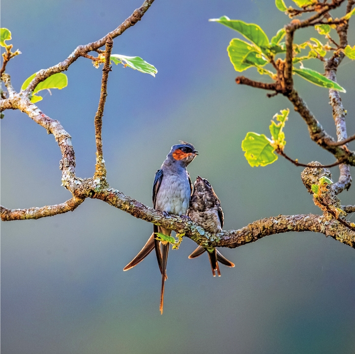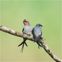 外形特征:凤头树燕是一种小型鸟类,体长约为21~25cm。头上具有一个长长的羽冠让其显得与众不同,羽冠闪耀着绿色的光泽,非常美丽。它的嘴短而圆,眼睛大,尾羽甚长,往尾尖逐渐变细,称为铗尾。上体为蓝灰色。虹膜褐色;嘴黑色;脚红色。