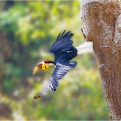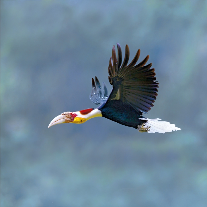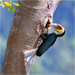 外形特征:小型犀鸟,体长84~102cm。尾白,雄雌两性的背、两翼及腹部均为黑色,但雄鸟头部奶白色,枕部具略红的丝状羽,裸出的喉囊上具明显的黑色条纹。雌鸟头颈黑色,喉囊蓝色。虹膜红色;嘴黄色,盔突有褶皱;脚黑色。