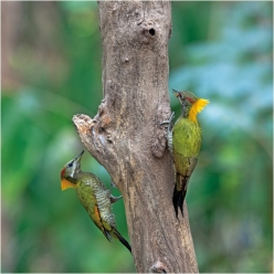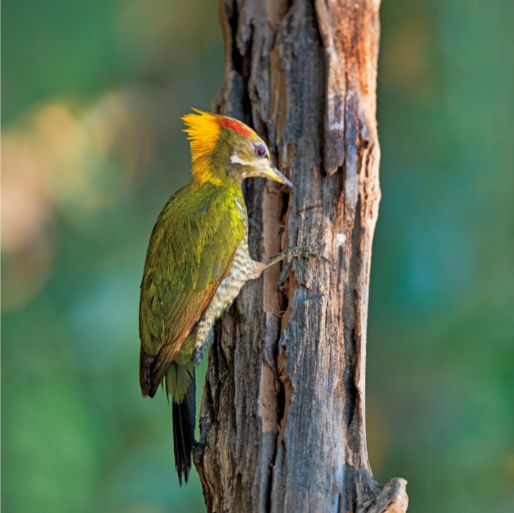 外形特征:小型绿色啄木鸟,体长23~27cm,额和眉纹鲜红色,头顶和耳羽橄榄绿色,枕部具有鲜黄色羽冠,极为醒目。颊部有一条白纹。上体和胸草绿色或橄榄绿色,腹至尾下覆羽淡黄白色而具褐色横斑。虹膜红色或朱红色。嘴黑色或灰黄色,先端和嘴峰角褐色,跗