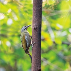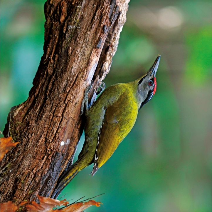 外形特征:大型啄木鸟,体长26~33cm。雄鸟前顶冠猩红,眼先、狭窄颊纹、后枕及后颈黑色,头部其余部分大致灰色。背部及两翼大部分黄绿色。下体全灰,腰部暗黄色,尾羽黑色具白色横纹。雌鸟顶冠灰色而无红斑。虹膜红褐色;嘴近灰色;脚蓝灰色。