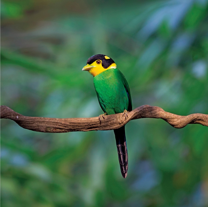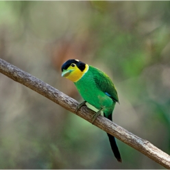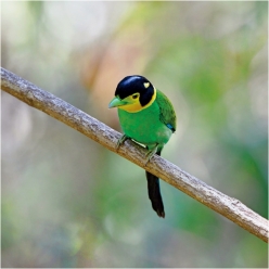 外形特征:中型鸟类,体长20~28cm。雄鸟和雌鸟的羽色相似,都比较艳丽,嘴形宽阔而平扁。头部及耳羽为亮黑色,顶部中央有一个亮蓝色斑块,稍沾紫色或淡黄白色,闪耀宝石光泽;后枕两侧各具一块鲜黄斑。前额基线至眼前,喉部及颈侧均为亮黄色。两翅基部亮钻蓝色,形成显著的翼镜,余部暗蓝色和绿色,近基部具白色翼斑。上体为亮草绿色;下体淡绿色,尾羽表面亮蓝色。虹膜褐色或红褐色;嘴黄绿色;跗跖橄榄绿色。