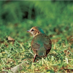 外形特征:体长22~25cm。雄鸟头顶后部至后颈辉蓝色,前头、眉纹、颊及耳羽褐黄;背羽辉绿沾棕;尾橄榄绿;翼覆羽色似背羽,飞羽褐色。下体棕褐。雌鸟体羽以褐为主,枕至后颈暗绿。虹膜淡褐色或暗褐色,眼睑肉红色;嘴褐色;脚粉褐色。