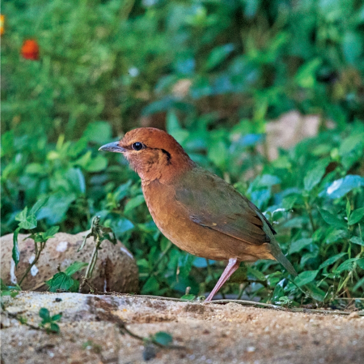 外形特征:体长为24~26cm。体型圆胖,尾短,腿长,常在森林底层或低植被中找食无脊椎动物。头部栗褐色。前额、两颊、颈侧、喉至上胸渲染粉红色。上体、尾表暗绿,腰沾蓝色,上背栗褐色。下体茶黄,肛周呈棕白色。虹膜棕红或红褐色;上嘴黑色,下嘴黄褐色;跗跖灰白色或角褐色。