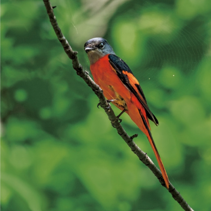 外形特征:体长18~22cm。雄鸟头部和背亮黑色,腰、尾上覆羽和下体朱红色,翅黑色具一大一小的两道朱红色翼斑。中央尾羽黑色,外侧尾羽基部黑色,端部红色。雌鸟额、头顶前部、颊、耳羽和整个下体均为黄色,腰和尾上覆羽亦为黄色。翅和尾颜色与雄鸟大致相似,但其上的红色由黄色取代。虹膜深褐色;嘴黑色;跗跖黑色。
