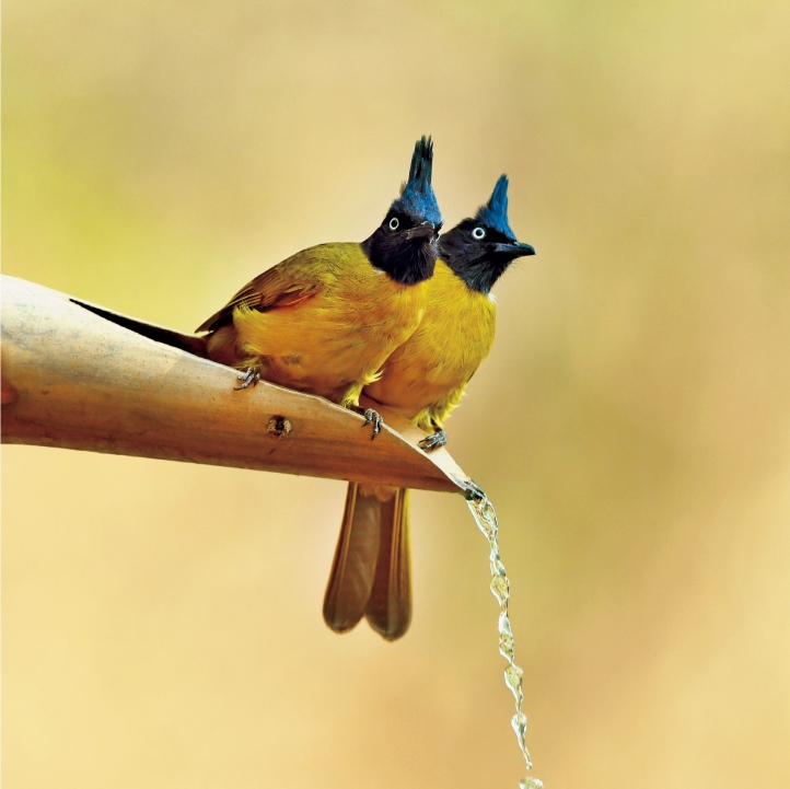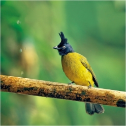 外形特征:中等体型黄色鹎,体长18~21cm。雌雄相似。成鸟整个头、颈、颏、喉全为黑色,头顶具直立而显著的黑色羽冠,上体橄榄黄绿色,尾羽暗褐色,下体鲜橄榄黄色。胸和两胁较深暗,翼缘鲜黄色,翼下覆羽黄白色。虹膜金黄色或淡黄色;嘴黑色;跗跖暗褐色或黑色。