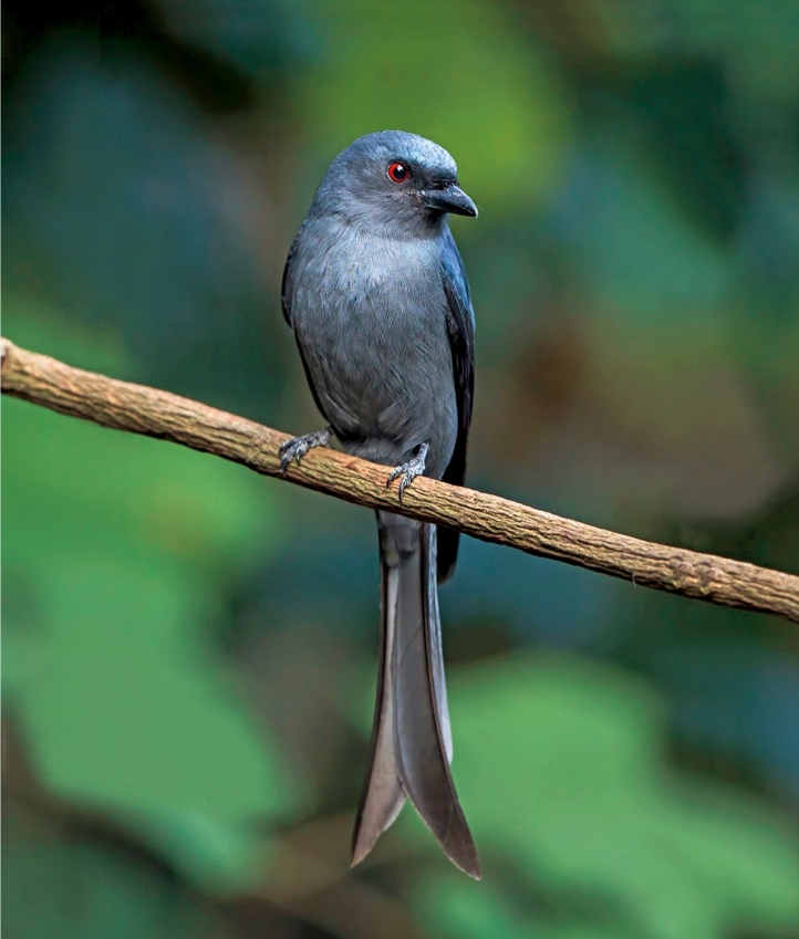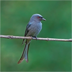 外形特征:中型卷尾类,体长27~31cm。嘴形强健侧扁,嘴峰稍曲,先端具钩,嘴须存在。鼻孔为垂羽悬掩。尾长而呈叉状,尾羽上有不明显的浅黑色横纹。跗跖短而强健,前缘具盾状鳞。全身暗灰色,鼻孔处的宽度与厚度几相等。虹膜橙红色;嘴黑色;跗跖黑色。