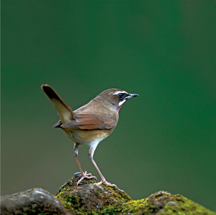外形特征:体型中等,体长14~16cm。具醒目的白色眉纹和颊纹,尾褐色,两胁皮黄,腹部皮黄白。雄鸟喉部鲜红色,雌鸟喉部红色面积小。雌鸟胸带近褐,头部黑白色条纹独特。成年雄鸟特征为喉红色。虹膜褐色;嘴深褐色;跗跖粉褐色。