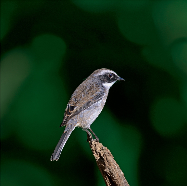 科鸟类,体长13~15cm。雄鸟上体暗灰色具黑褐色纵纹,白色眉纹长而显著,两翅黑褐色具白色斑纹,下体白色,胸和两胁烟灰色。雌鸟上体红褐色微具黑色纵纹,下体颏、喉白色,其余下体棕白色。虹膜褐色;嘴黑色;跗跖黑色。